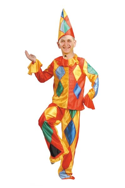 В комплект карнавального костюма забавного Арлекина входят куртка, брюки и колпак.