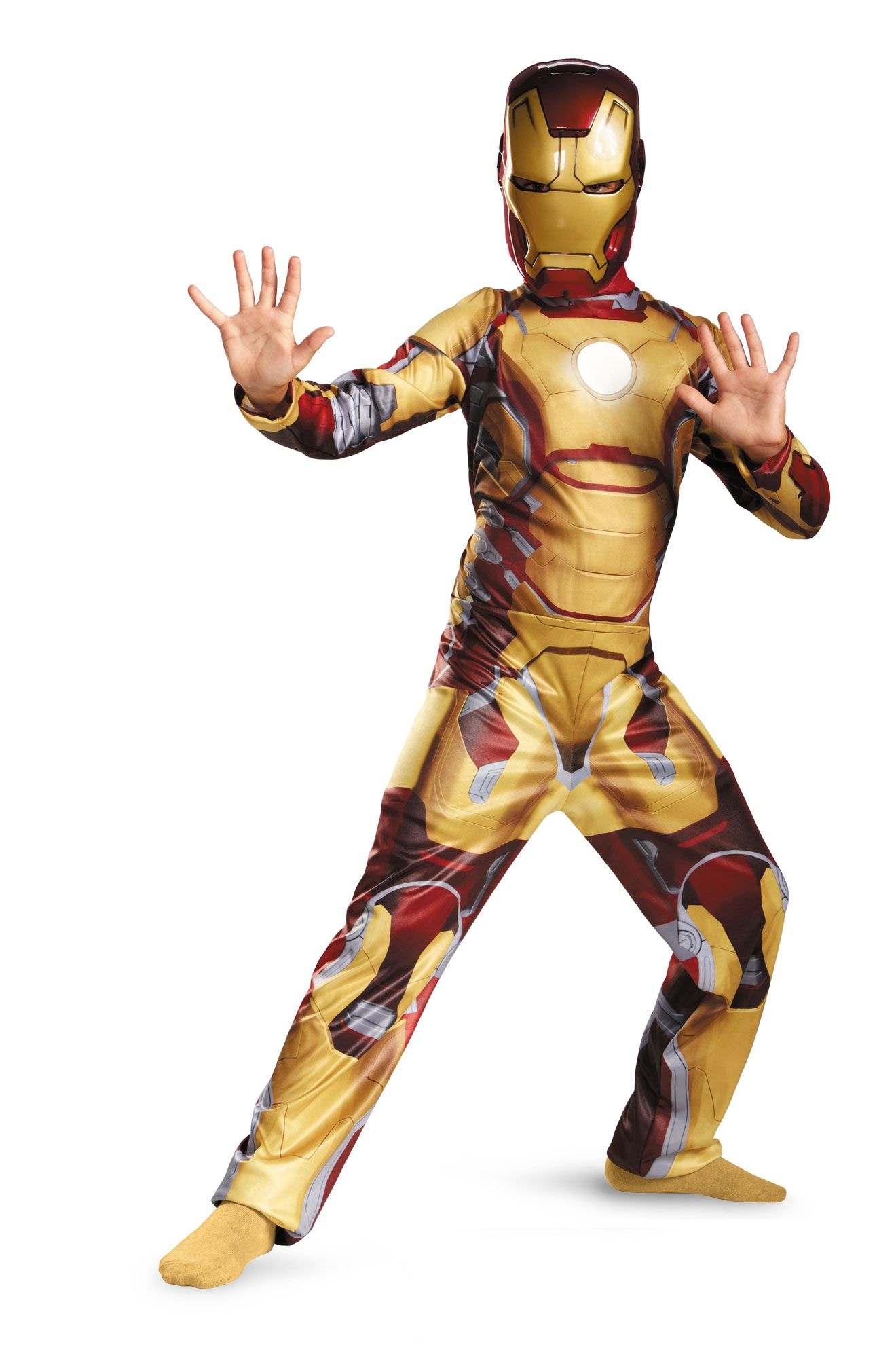 Костюм включает в себя комбинезон со светодиодом в середине груди и маску.
