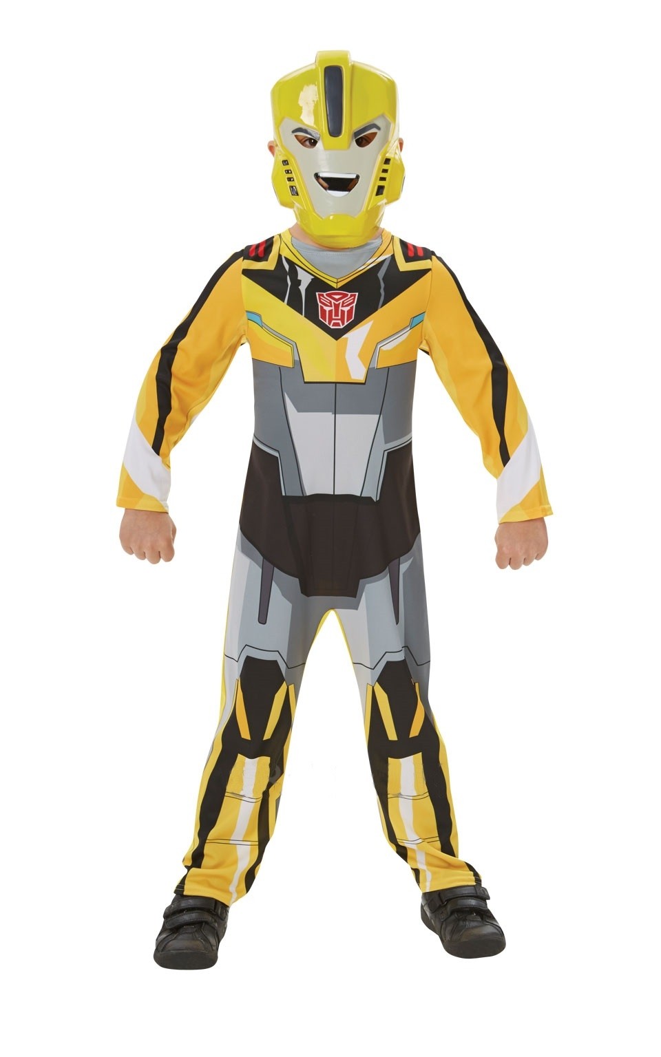 Костюм Трансформера Бамблби детский - самый яркий и запоминающийся герой из Трансформеров. Костюм включает в себя яркий желтый комбинезон с черно-серым принтом доспехов, а также пластиковую желтую маску, которая имитирует шлем Трансформера Бамблби.