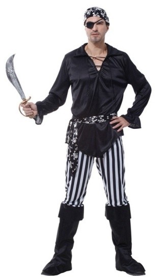Костюм кровожадного пирата отлично подойдет для создания образа настоящего морского разбойника. Костюм включает в себя черную рубашку со шнуровкой на горловине, полосатые брюки с накладками на обувь, бандану на голову, повязку на глаз и пояс.