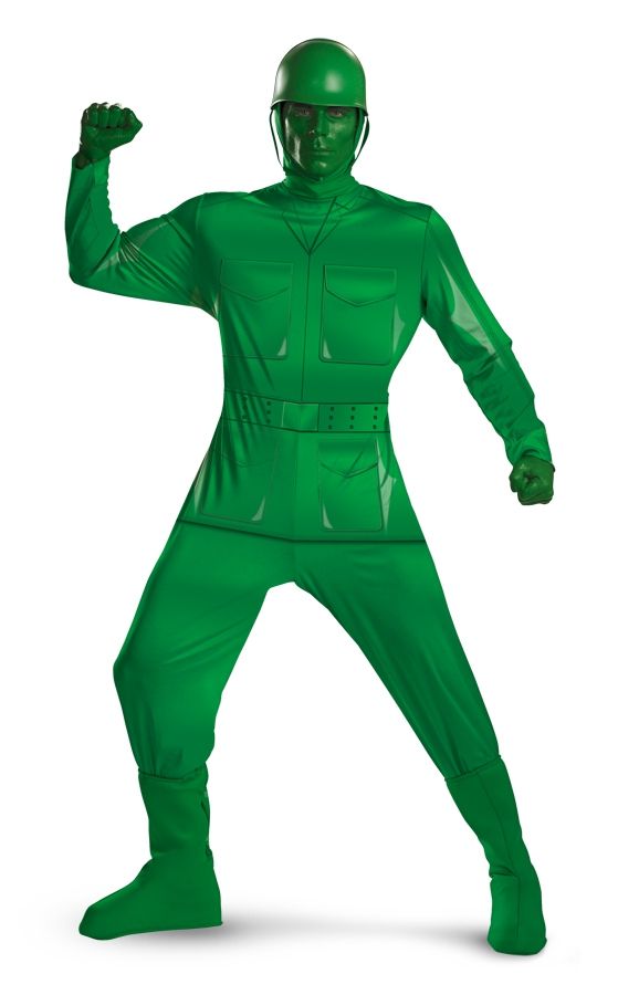 Костюм Зелёного солдатика включает в себя зелёный комбинезон, каска, капюшон и накладки на обувь. Свой образ вы можете дополнить зелёным гримом и будете похожи на классического зелёного солдатика.