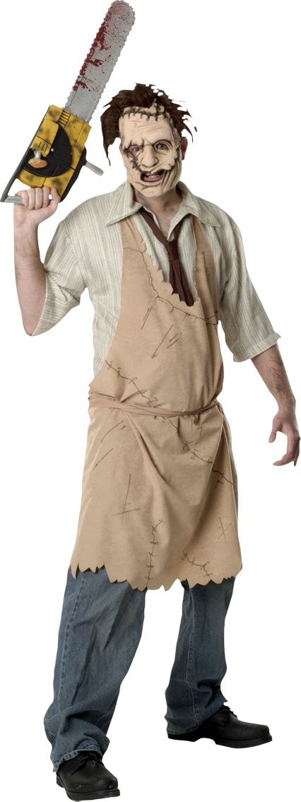 Устрашающий костюм из фильма "Кожаное лицо: техасская резьня бензопилой". Маска с волосами, фартук с рисунком, рубашка с галстуком. Бензопила покупается отдельно.