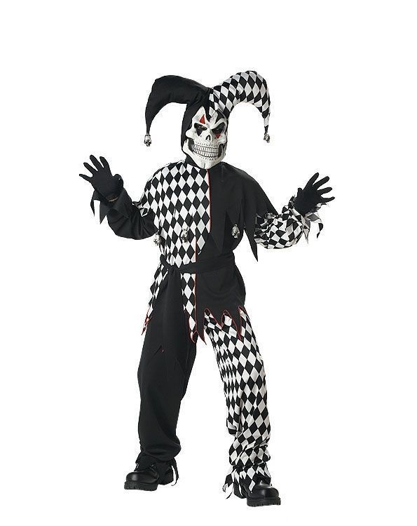 Детский костюм дьявольского шута выполнен в черно-белом цвете. В комплект входит рубашка с остроконечным подолом, брюки с разными штанинами, черный пояс, а также жуткая маска и головной убор с бубенчиками. Этот жуткий костюм подойдет для Хэллоуина, Пятницы 13 и подобных праздников. Этот парень не будет шутить...
