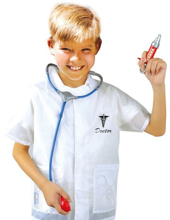 Детский набор доктора включает в себя белый халат с карманами и эмблемой на груди. Также в набор входят необходимые инструменты для доктора: стетоскоп, шприц, ножницы, молоточек.