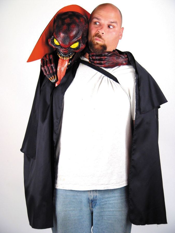 Костюм Удушающий демон представляет собой плащ, к которому прикреплена голова демона с руками. Надев такой костюм, будет создано впечатление, что к вам на плечо забрался демон и пытается вас задушить.