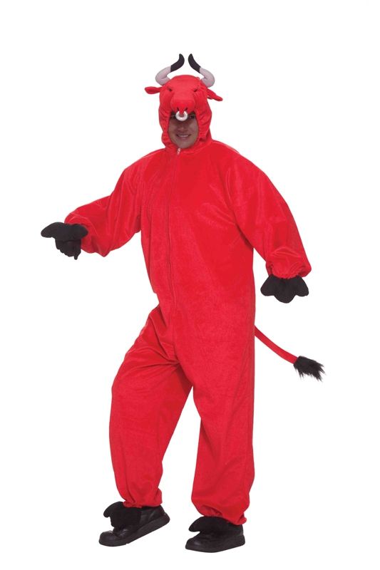 Костюм красного бычка выполнен в красном цвете, с чёрными руками и ногами. В комплекте имеется головной убор с рожками и комбинезон с хвостом.