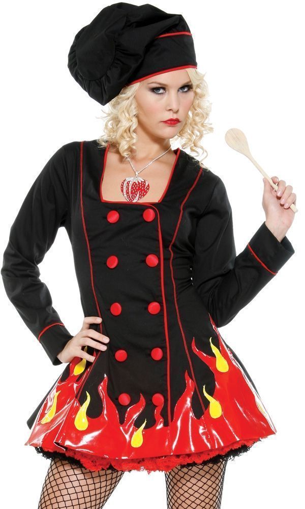 Женский костюм огненного повара выполнен в черном цвете с красными и желтыми вставками. В комплект костюма входит платье с длинными рукавами и красными пуговицами, низ платья украшен языками пламени, также имеется колпак повара и деревянная ложка. Подъюбник, ожерелье и колготки в комплект не входят.