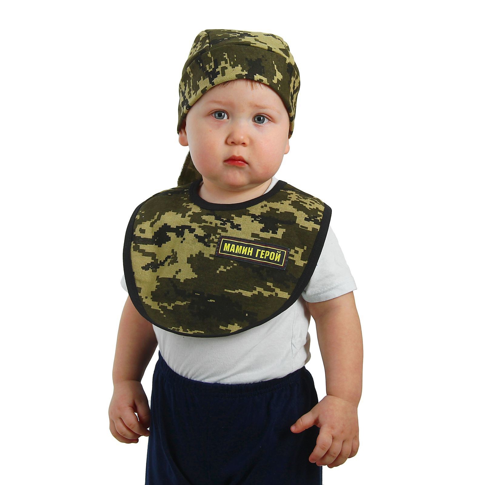 Набор для малышей Мамин Герой выполнен в камуфляжной пиксельной расцветке. В комплект входит закругленный нагрудник с нашивкой, а также бандана на завязках.