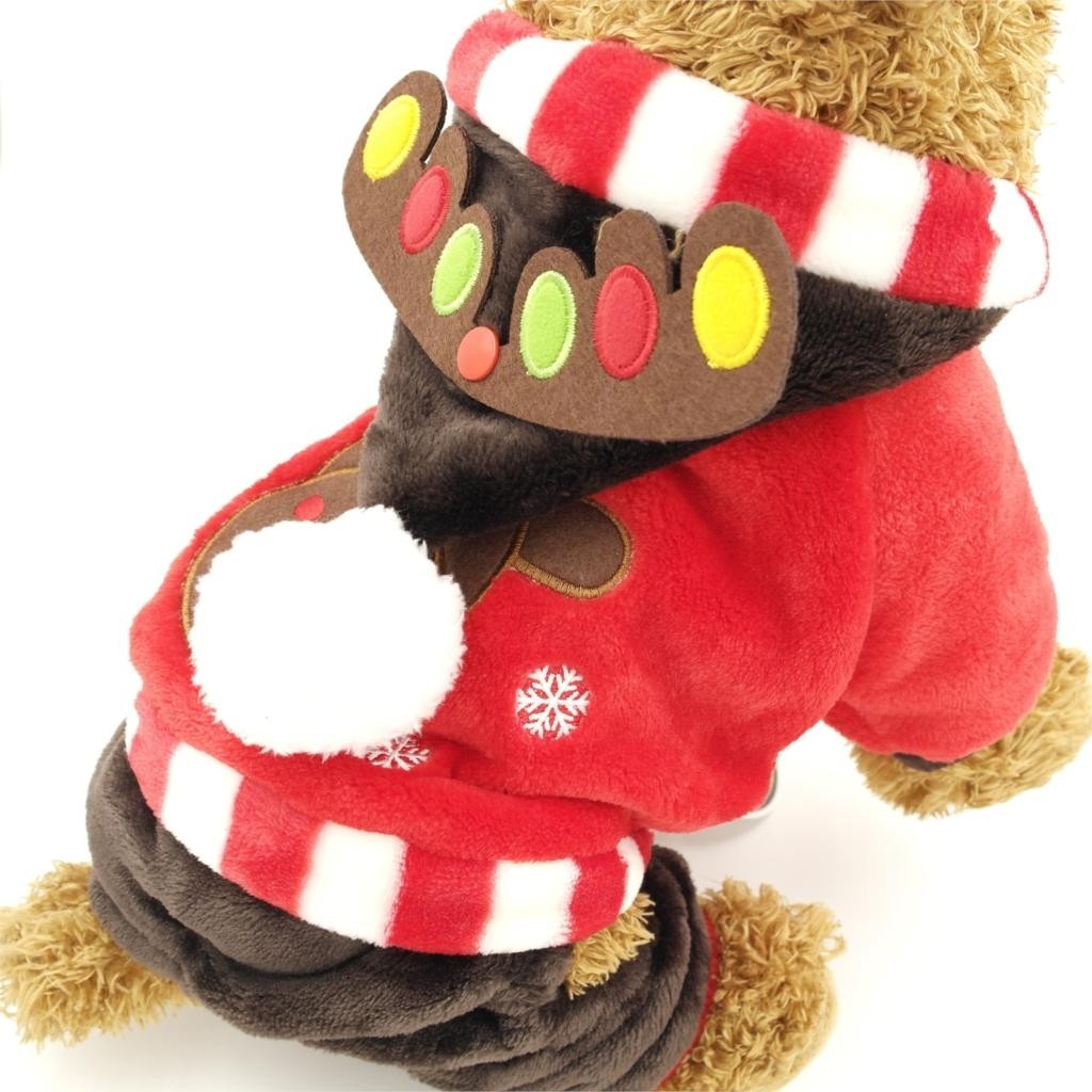 Новогодний костюм для собаки Олененок выполнен из плюшевого материала красно-коричневого цвета. Комбинезон с капюшоном в виде мордочки новогоднего Оленя в колпаке.