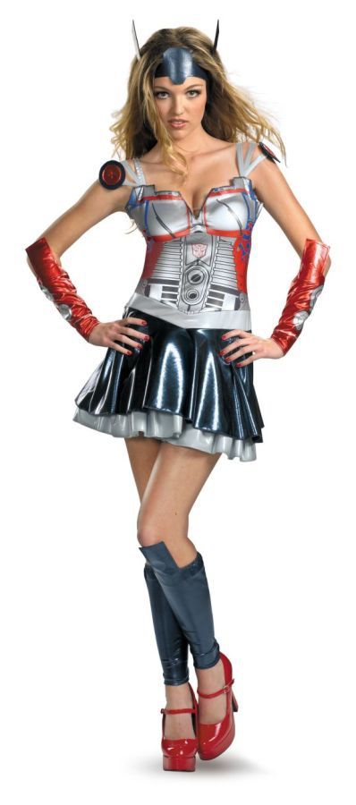 Женский костюм Оптимус Прайм включает в себя: платье,подъюбник, головной убор, перчатки,гетры. Имитация винила.