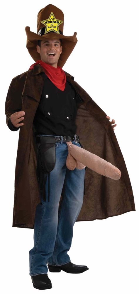 Костюм самого большого в Техасе включает в себя шляпу, платок на шею, плащ, пояс с кобурой и большое мужское достоинство. В таком креативном костюме вы просто не сможете остаться без внимания. В таком костюме вы будете смотреться весьма забавно. Где можно ещё увидеть такого ковбоя?