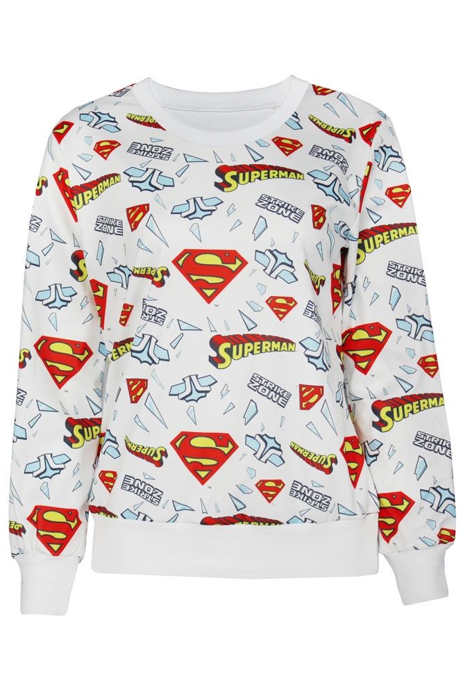Белая толстовка Супермен украшена принтами в виде надписей и эмблем в стилек комиксов Superman. Подходит для прохладной погоды.
