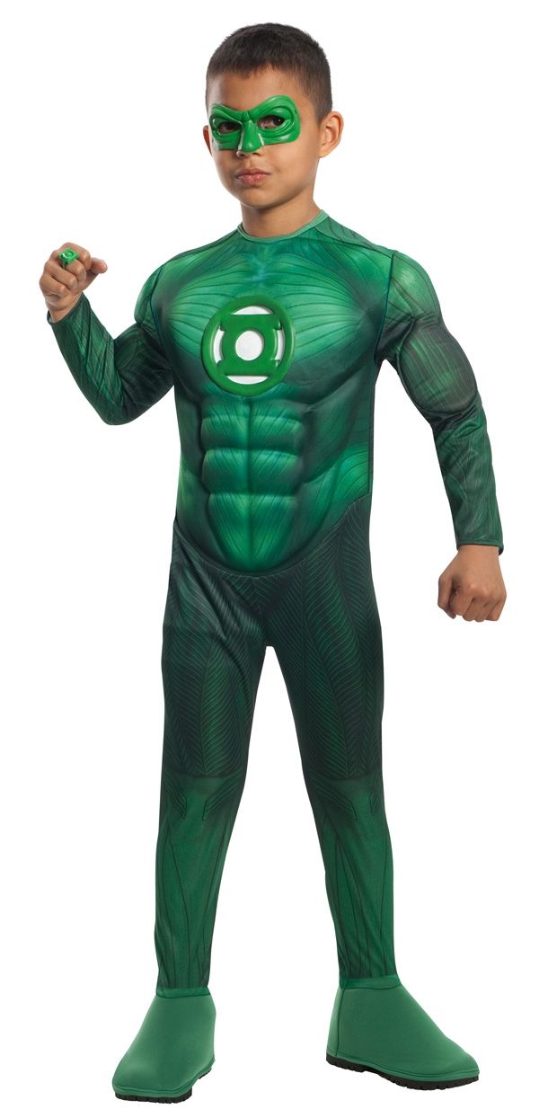 Костюм Хэла Джордана для детей - супергероя комиксов, включает в себя зеленый комбинезон с объемными мышцами груди, зеленую маску на глаза, а также зеленое кольцо силы.