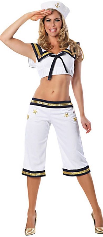 Костюм лучезарной морячки - это белоснежный костюм с черно-золотой отделкой. Костюм включает в себя бриджи до колен, короткий белый топ с воротничком и шапочку морячки с изображением якоря. С такой морячкой можно смело отправляться в плавание!