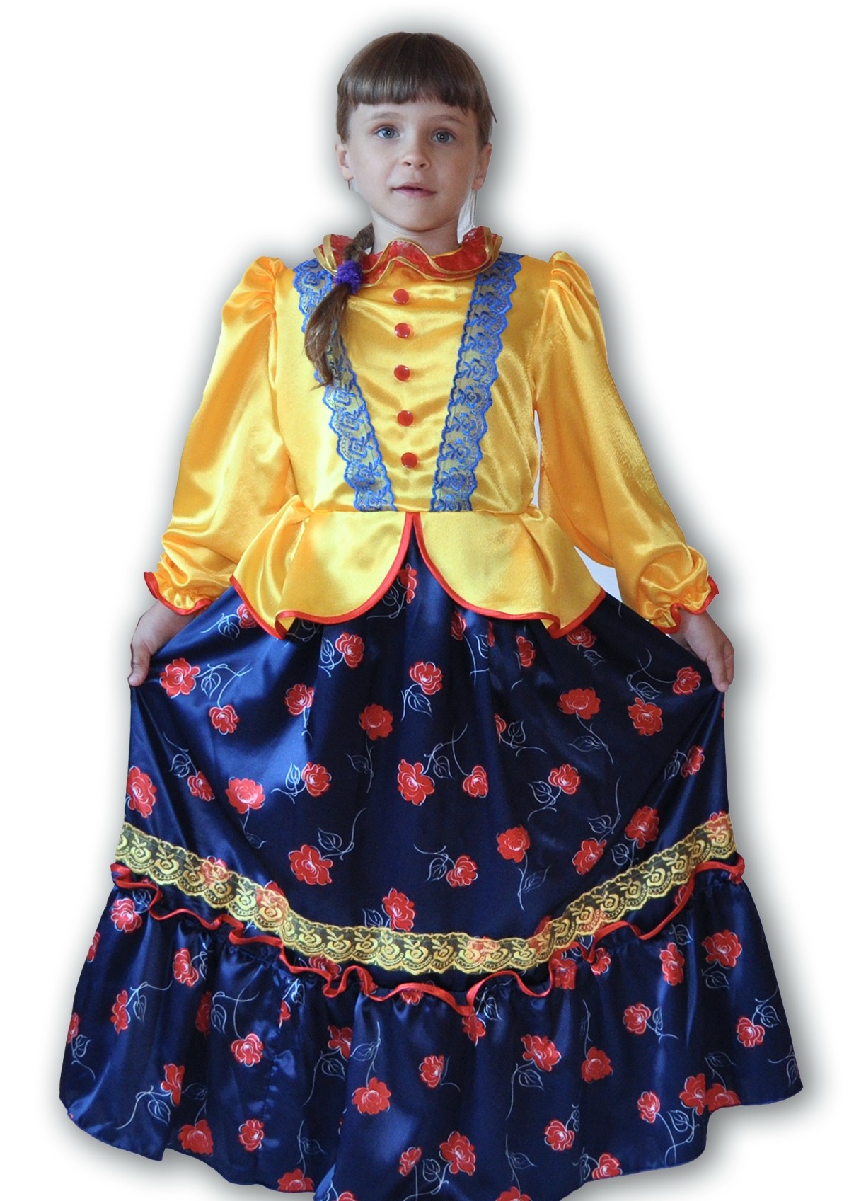 Детский костюм Донской казачки выполнен из атласного материала. В комплект входит желтая блузка с приподнятыми плечиками. Блузка с отделкой из кружева. Также в комплекте имеется длинная синяя юбка с красным цветочным узором и отделкой из кружева.