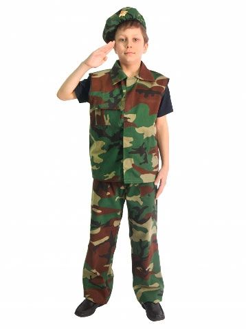 Костюм солдата выполнен из камуфляжной ткани. Жилетка застегивается на груди на липучку, беретка регулируется по ширине шнурком. Широкие брюки, собранные на резинку, не стесняют движения. Костюм Военного понравится будущим защитникам Родины. Рекомендуем дополнить костюм темными ботинками в цвет изделия и темной футболкой. [removed] [removed] [removed] [removed]