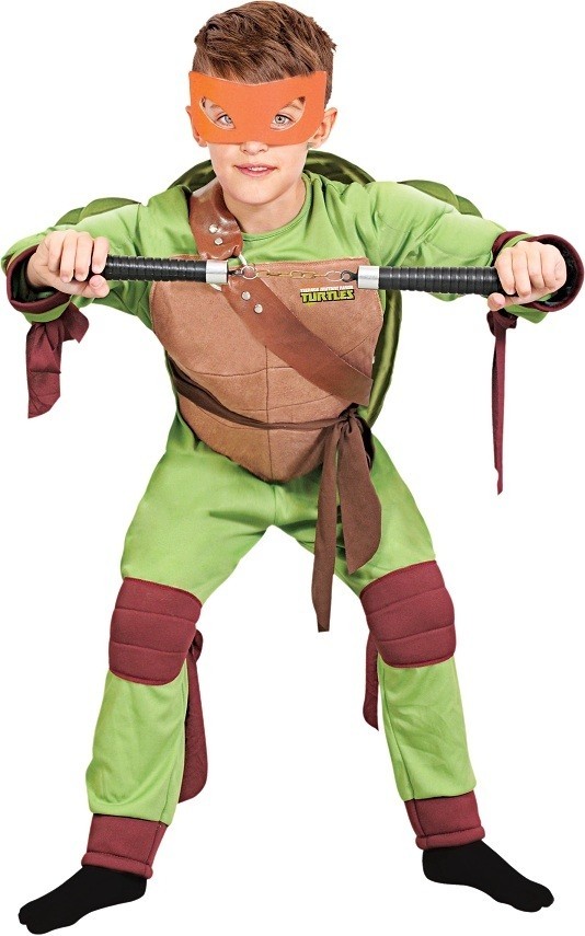 Детский костюм Микеланджело представляет собой образ отважной Черепашки Ниндзя. В комплект костюма входит зеленый комбинезон с коричневой накладкой на груди и панцирем на спину, также костюм дополняют нарукавники и наколенники.