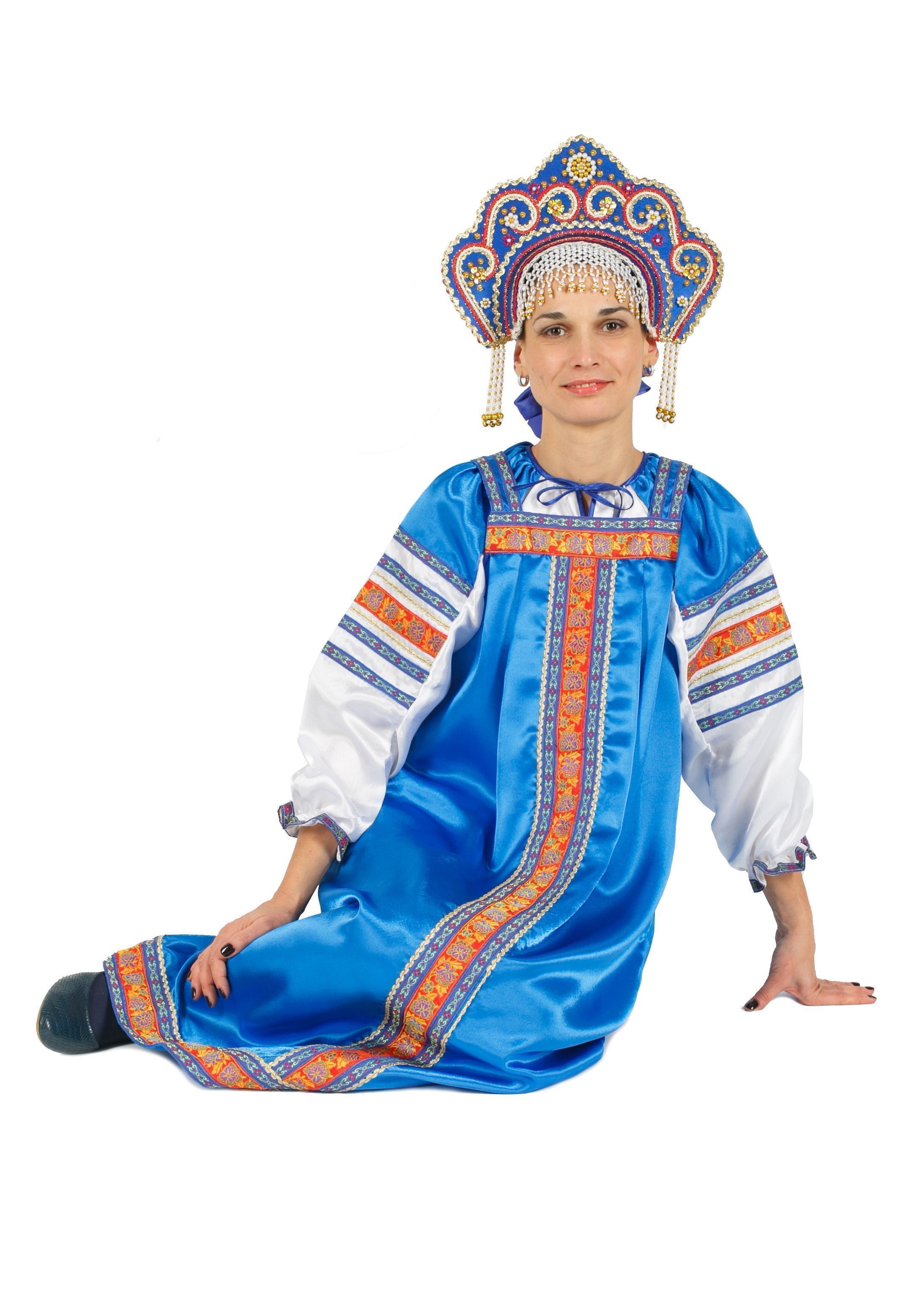 Костюм Марья синий представляет собой русский народный сарафан в пол. Он выполнен из синего атласного материала, его украшает узорчатая широкая тесьма.