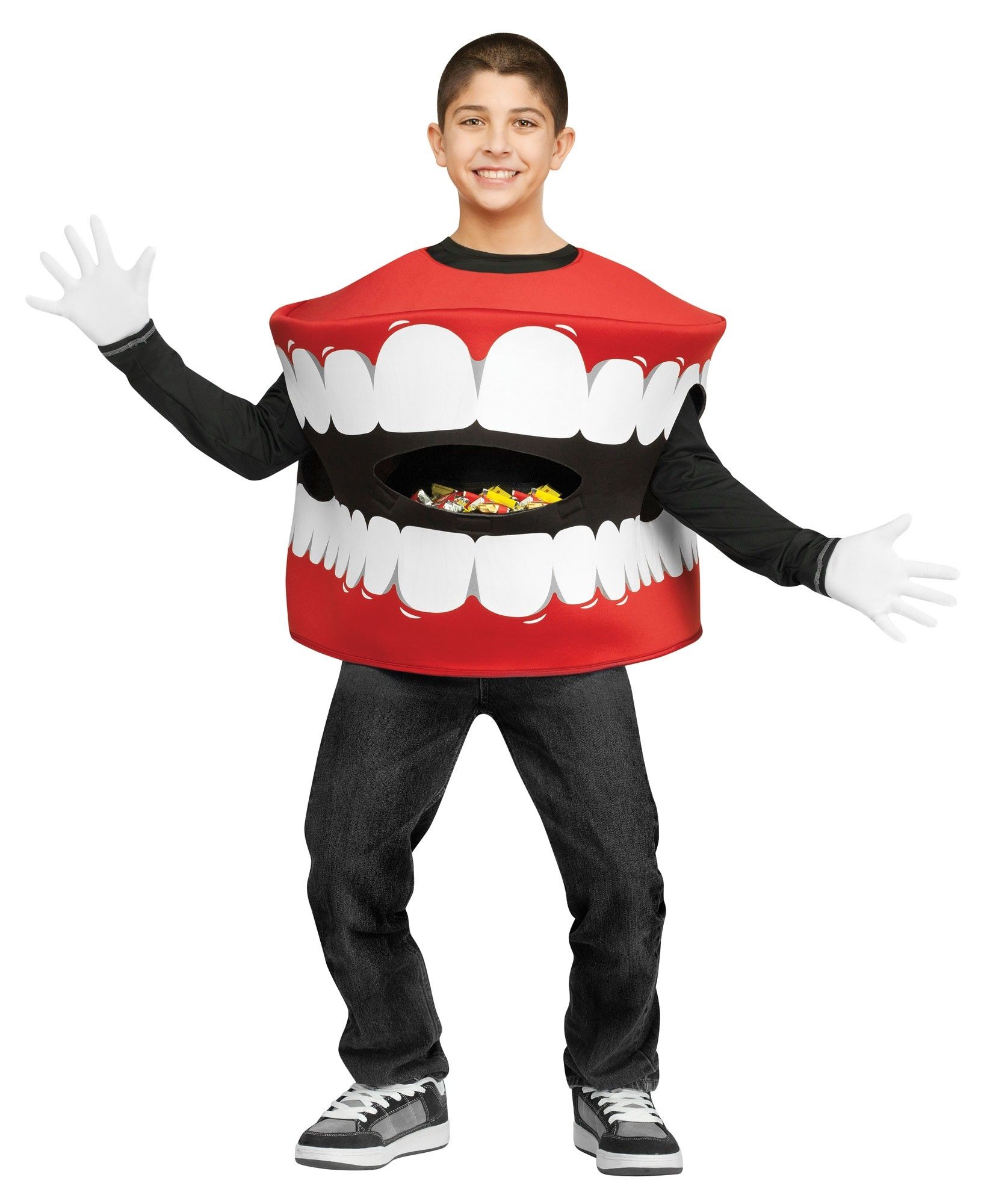 Детский костюм Рот - сборщик конфет представляет собой забавный костюм в виде полуоткрытого рта с белыми зубами. В комплект входит туника с мешком внутри, который предназначен для сбора конфет. Такой костюм станет идеальным для Хэллоуина.