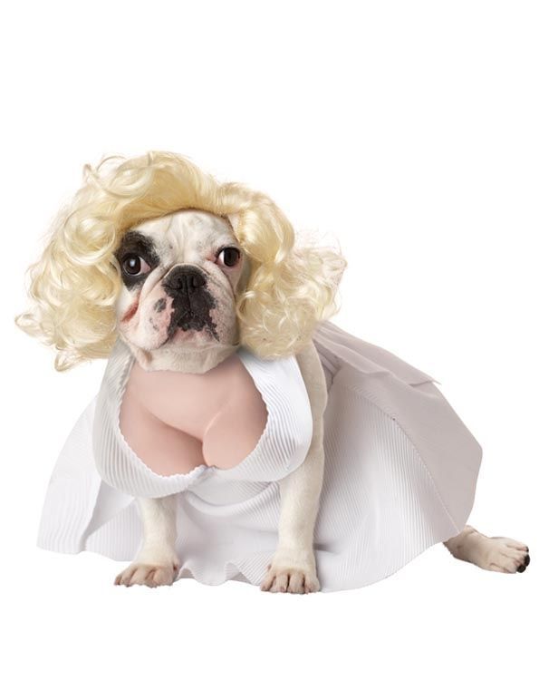 Костюм для собаки Звезда экрана - это позитивный костюм для вашей собачки. Костюм состоит из парика светлых кучерявых волос, а также белого платья с накладной грудью.
