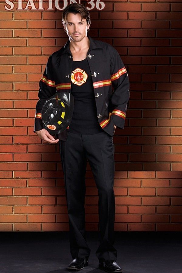 Отличный костюм настоящего мачо-пожарного. Жакет на застежках спереди, со светоотражающей отделкой, майка "Пожарный департамент", пожарная каска (брюки не входят в комплект, вы можете использовать любые брюки или джинсы по Вашему усмотрению).
