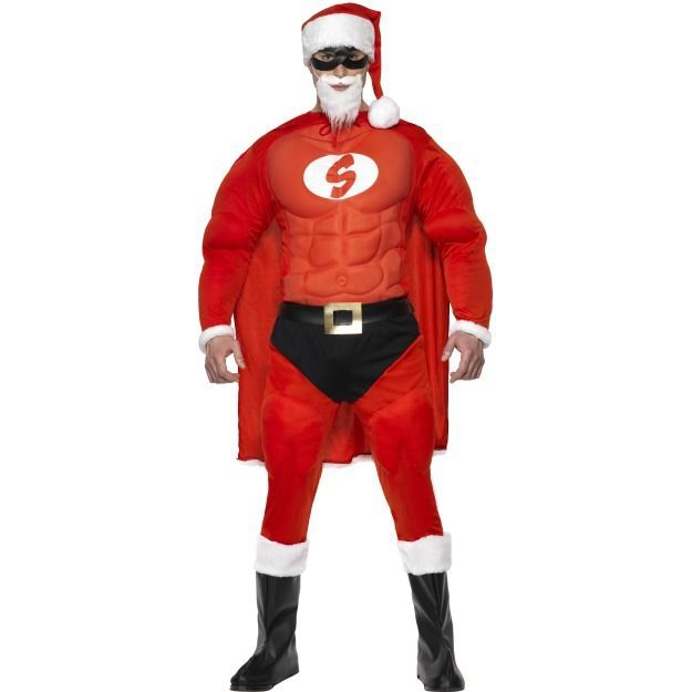 Костюм Супер Санты включает в себя классический колпак Санты с белым помпоном, черную маску на глаза, белую короткую бородку, красный длинный плащ, кофту с рельефным рисунком мускул, черный пояс, брюки и накладки на сапоги. Этот супер-костюм подойдет для новогодних маскарадов и подобных мероприятий.