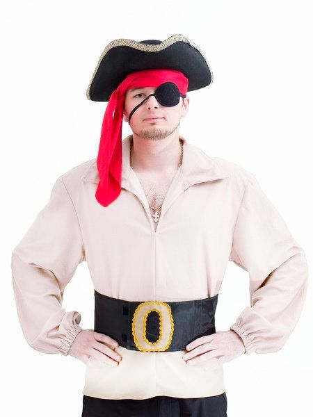 Костюм пирата со шляпой - это костюм для взрослых, который включает в себя белую рубашку, черный широкий пояс, красную бандану, которая дополняется черной шляпой, а также главный пиратский атрибут - черная повязка на глаз,черная безрукавка
