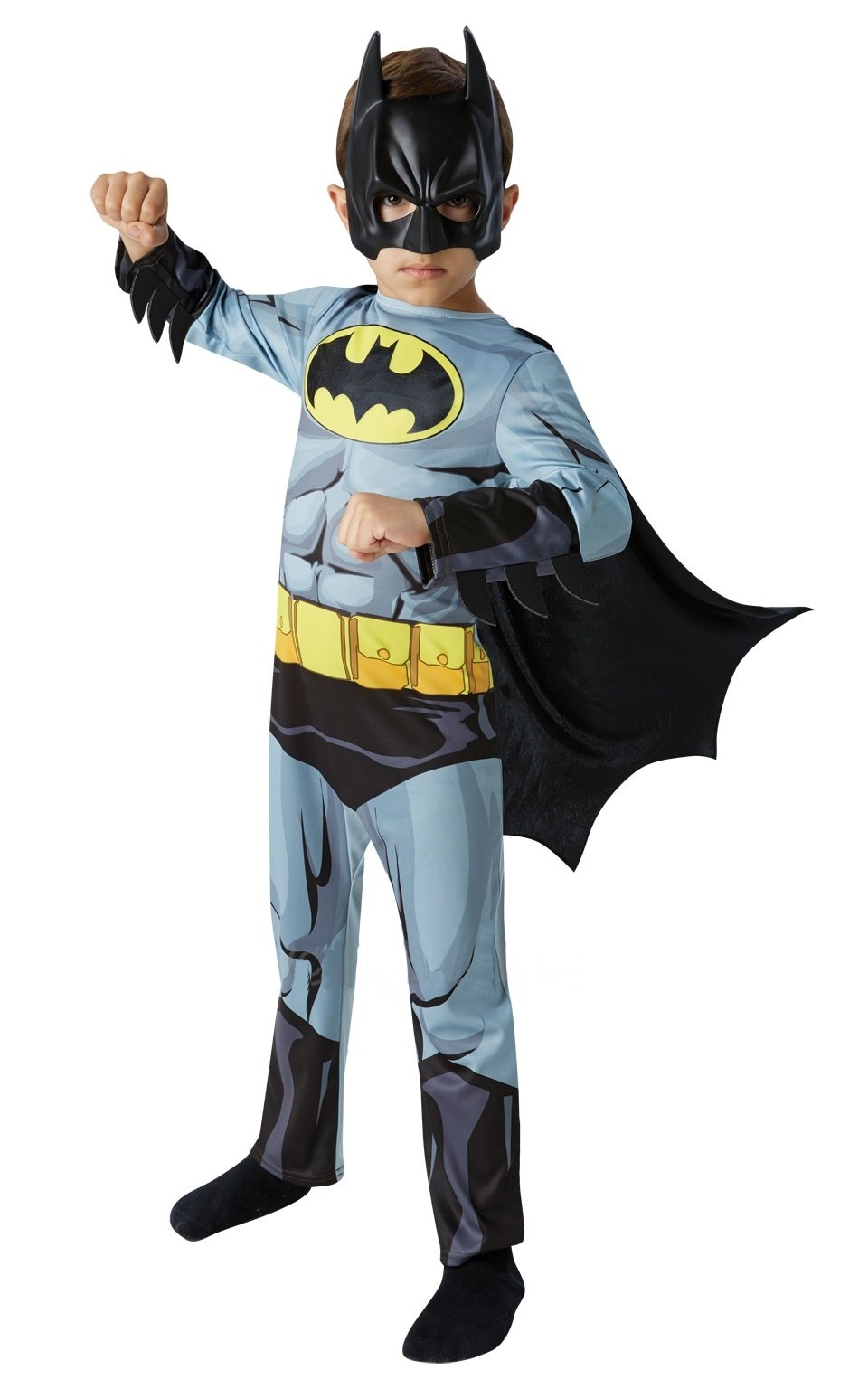 Костюм Бэтмена из комиксов включает в себя серый комбинезон с принтом доспехов Бэтмена, пояса и эмблемы. Также костюм дополняет черный плащ-накидка и черная маска на пол лица. Маска с ушками и удобными прорезями для глаз.