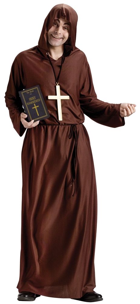 Костюм пьяного монаха - это шуточный костюм, который подойдет для различных маскарадов. В комплект костюма входит длинная роба с капюшоном, выполненная в коричневом цвете, также имеется пояс-шнурок, книга-обманка, в которой находится серая пластмассовая фляжка и две рюмочки.