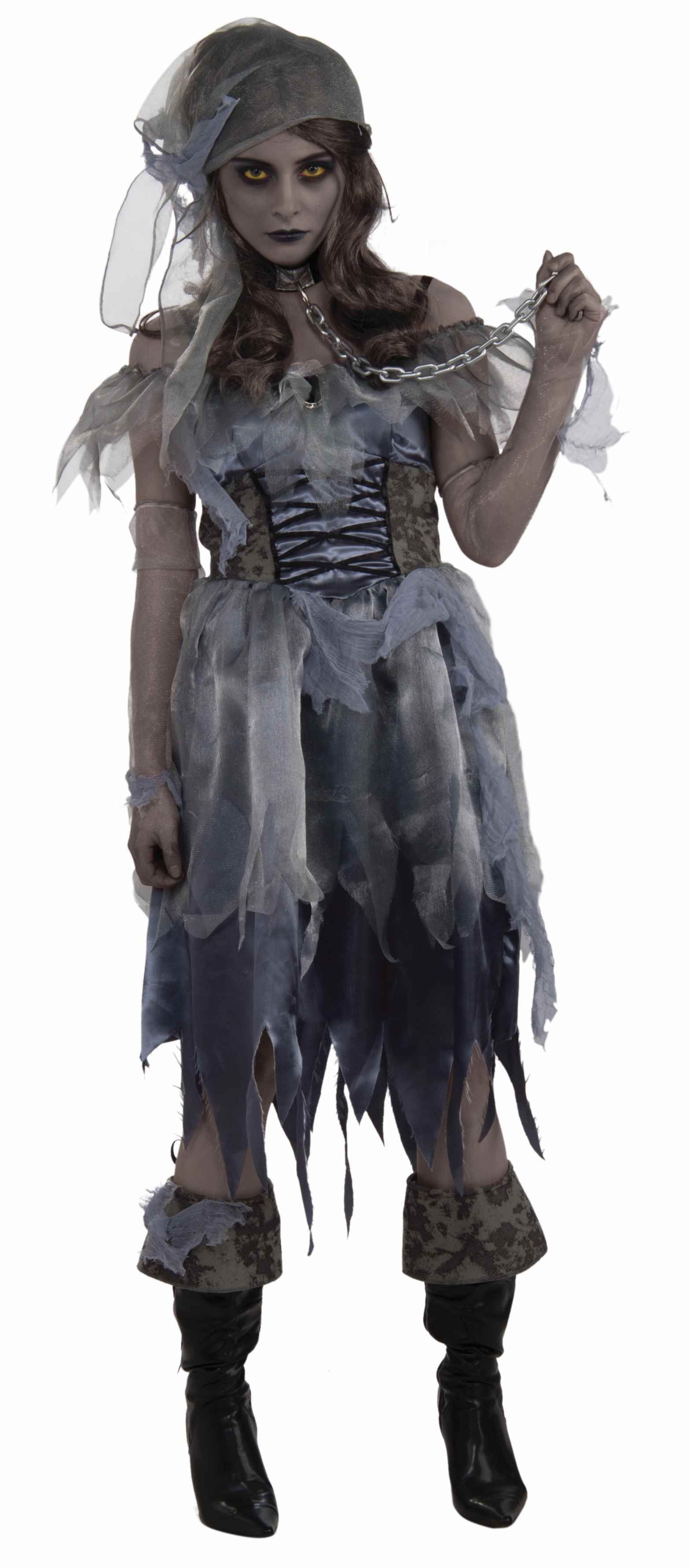 Костюм зомби-девушки пиратки включает в себя серое оборванное платье, платок на голову, отдельные рукава, цепочку на шею, а также пиратские накладки на обувь.