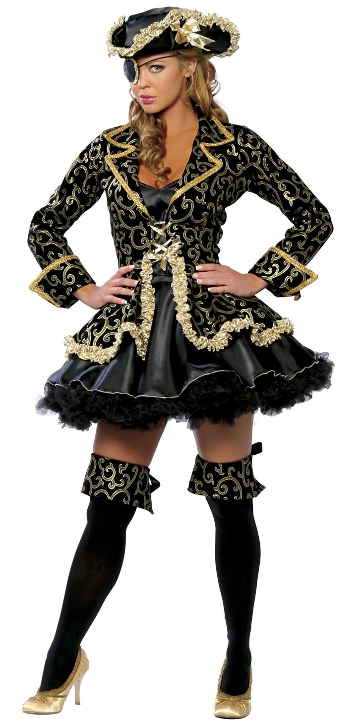 В комплект входит:платье с пышным подъюбником, камзол, шляпа, накладки на сапоги, пиратская повязка на глаз.