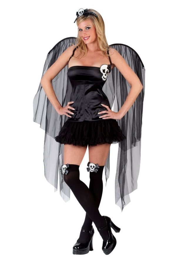 Интересный костюм готической феи представляет собой черное мини платье с изображение черепа. В комплект входят крылья в готическом стиле, чулки и повязка. Костюм можно надеть на Хэллоуин или корпоратив. Платье можно использовать без крыльев в качестве наряда для вечеринки.
