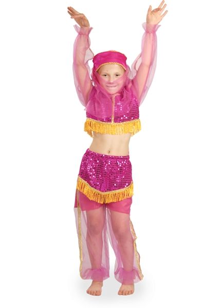 В комплект костюма принцесса Жасмин розового цвета входят розовый топ, шаровары, шапочка с вуалью.