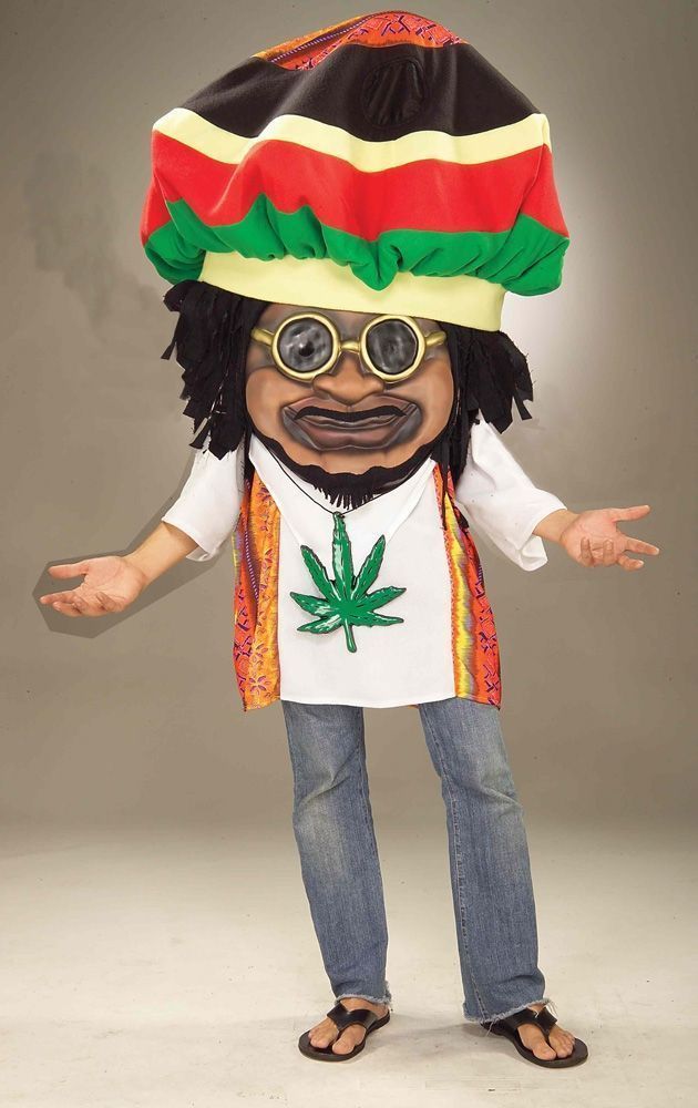 Забавный костюм растамана включает в себя тунику, ожерелье на шею в виде большого листика конопли, а также огромную маску ямайского парня с дредами, в очках и полосатой шапочке. В маске имеется сеточка для ваших глаз - вы будете видеть все, но зато вас не увидит никто.