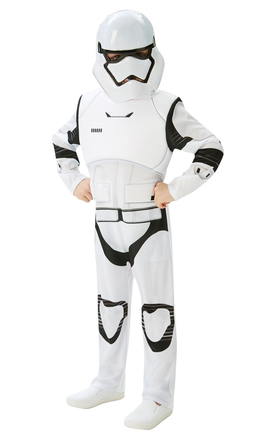 Детский костюм Штурмовика Dlx - белый костюм одного из персонажей саги "Звездные войны". Костюм включает в себя белый комбинезон с принтом в виде отдельных частей брони. К нему пришита мягкая объемная броня на грудь и плечи. Завершает костюм маска 1/2, которая имитирует шлем с прорезями на уровне глаз и рта.