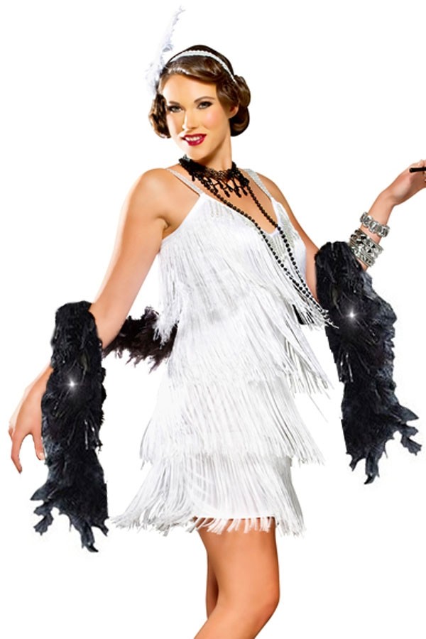 Костюм блестящей Звезды Голливуда включает в себя белое платье в ретро-стиле с бахромой. Также к нему прилагается серебряная повязка на голову, дополненная пером. Для завершения образа можно приобрести перьевое боа и другие аксессуары и украшения.