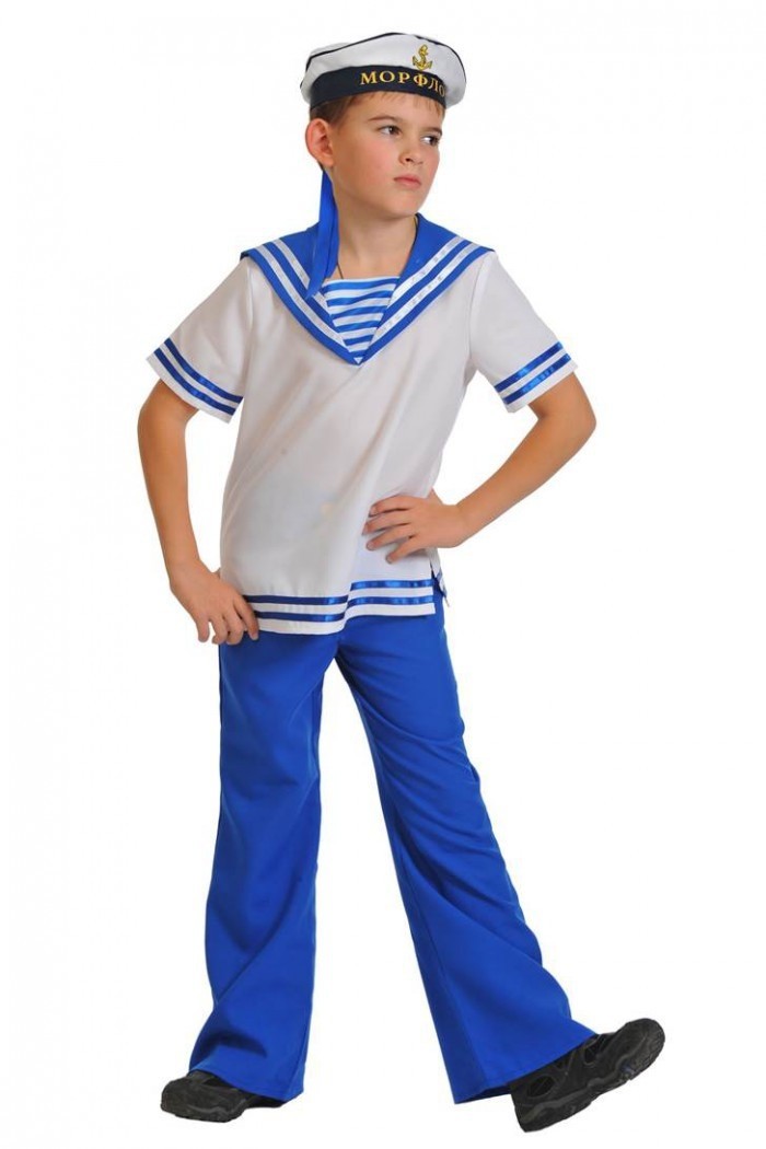Детский костюм морячка бело-синий костюм, который включает свободную футболку белого цвета с синим воротничком, свободные брюки-клеш ярко-синего цвета, а также белую бескозырку моряка.