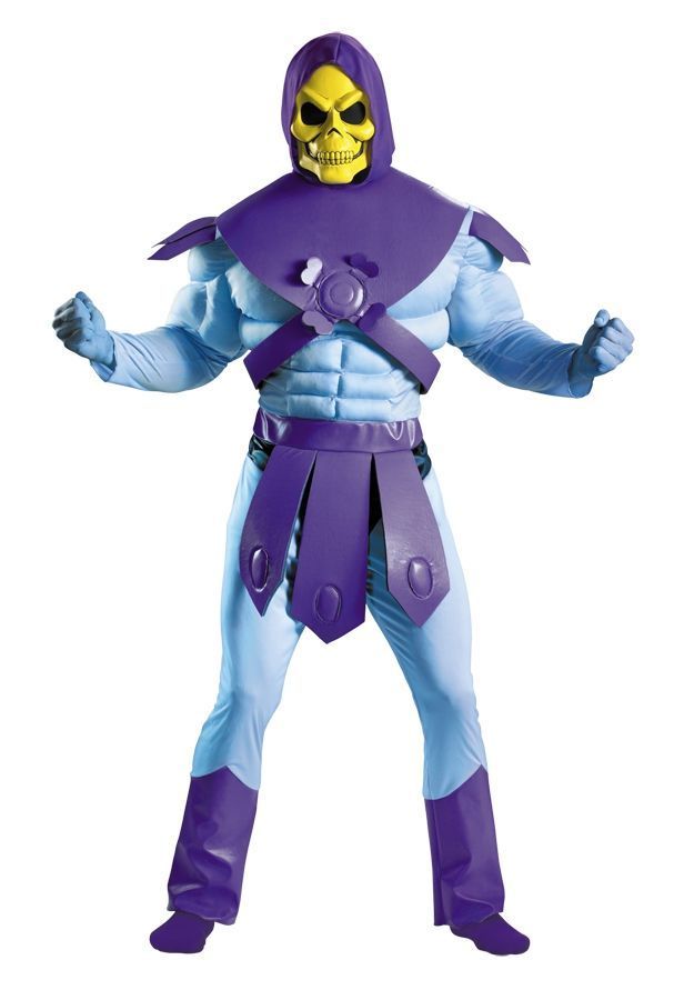 Костюм мускулистого Скелетора выполнен в фиолетово-голубом цвете. В комплект входит комбинезон с мышцами, доспехами и поясом, а также жёлтая маска с капюшоном. Костюм можно надеть на маскарад, карнавал или тематическую вечеринку.