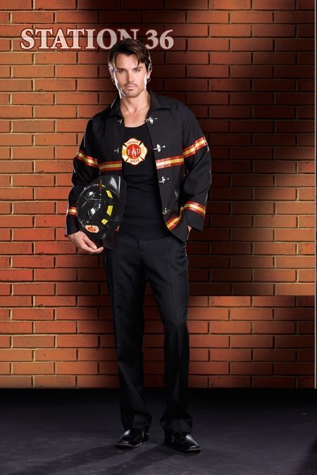 Стильный костюм пожарного для настоящего мужчины. Комплект состоит из майки с эмблемой пожарной службы, жакета на застежках спереди и светоотражающими элементами и пожарной каски. Брюки в комплект не входят.