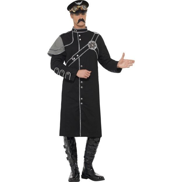 Костюм военного в стиле стим панк представляет собой длинный черный плащ с серой отделкой и принтом. Различные военные аксессуары вы можете приобрести у нас на сайте.