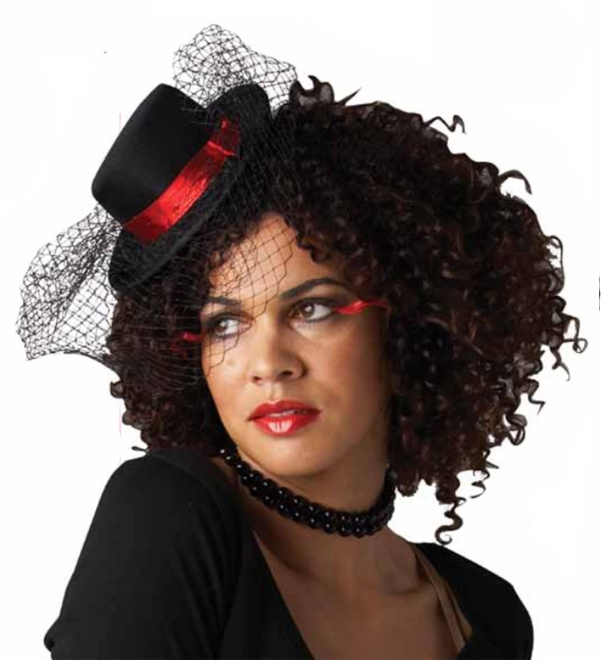 Мини-шляпка Бурлеск - это черная небольшая шляпка, украшенная красной атласной ленточкой и черной сеточкой, слегка прикрывающей глаза.