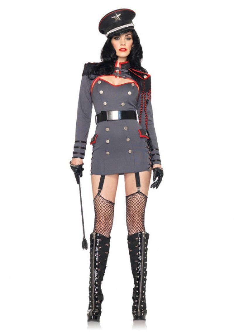 Костюм Генеральское наказание выполнен в сером цвете и включает в себя короткое платье с декоративными кнопками. Также в комплект входит болеро с черными эполетами, черный пояс к платью и генеральская фуражка.