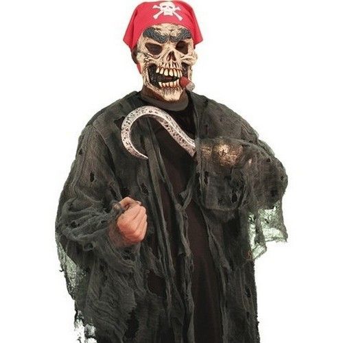 Костюм скелета-пирата подходит для Новогодних вечеринок, Хэллоуина, Пятницы 13 и других подобных праздников. В комплект костюма входит латексная маска с красной банданой, крюк на руку и рваная туника. К костюму можно подобрать различные пиратские аксессуары и другие вещи.
