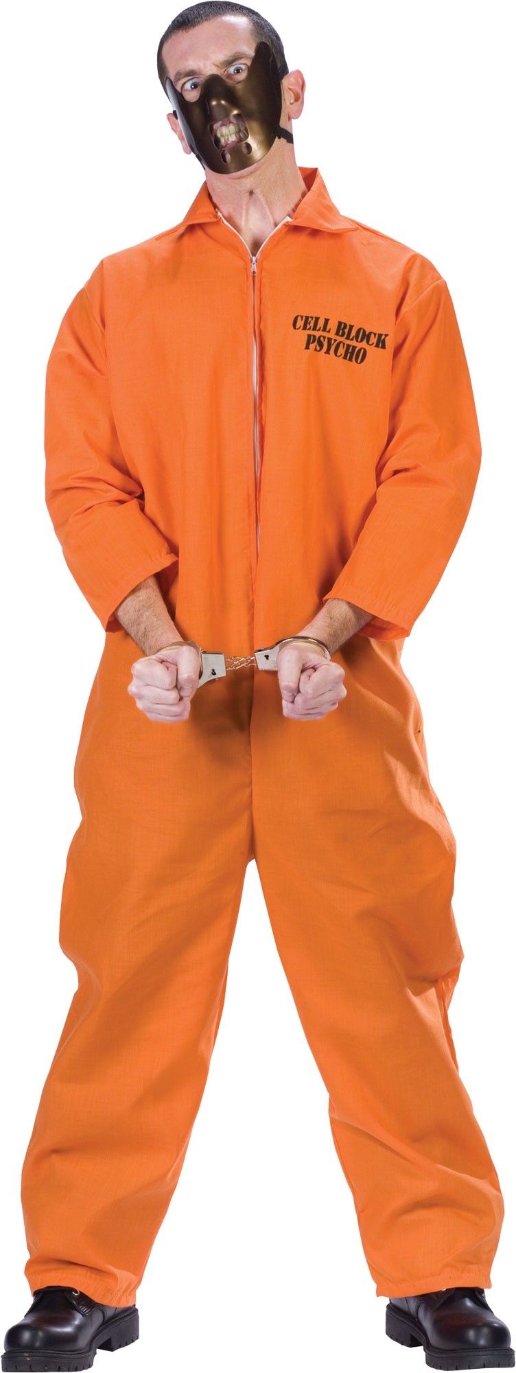 Костюм психа из тюремного корпуса включает в себя оранжевый комбинезон заключенного на молнии. На груди и сзади имеется черная надпись Cell Block Psycho. Также в костюм входит маска на лицо на ремнях и наручники.