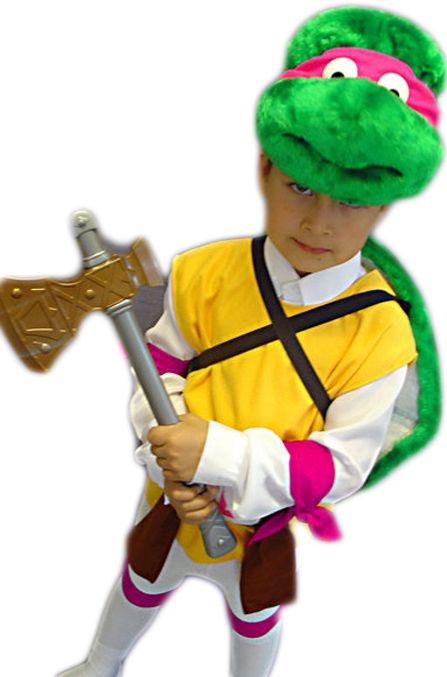 Детский костюм Черепашки Донателло - это яркий костюм всеми любимой и известной Ниндзя Черепашки. В комплект входит зеленая меховая маска с глазами и розовой повязкой на глаза, желтая безрукавка, меховой зеленый панцирь на черных ремнях, а также розовые повязки на ноги и руки. Костюм завершает пояс с бляхой с соответствующей имени буквой.