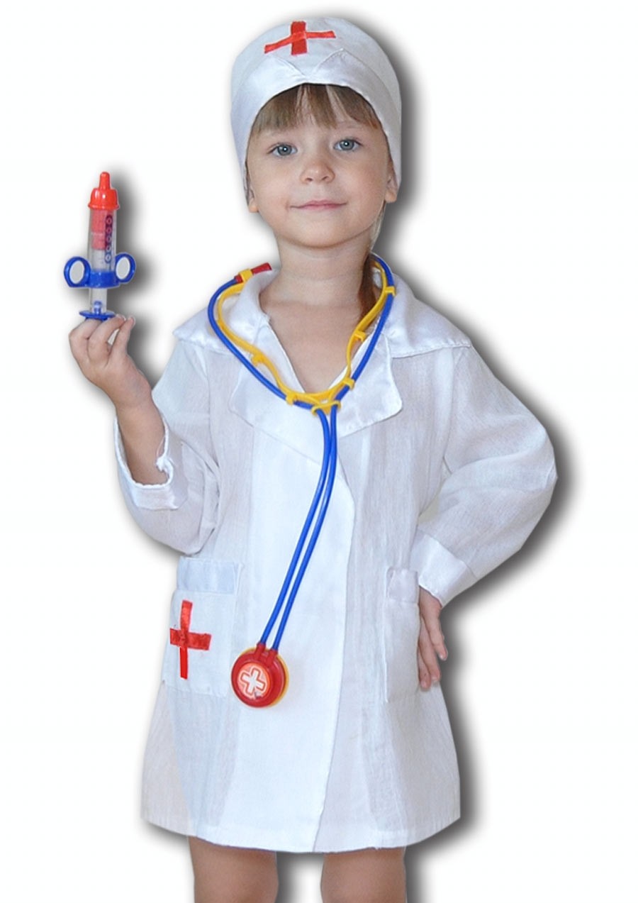 Костюм Доктора для девочек включает в себя белый халат с боковым карманом с красным крестом, медицинскую шапочку с красным крестом, а также пластмассовый шприц и стетоскоп.