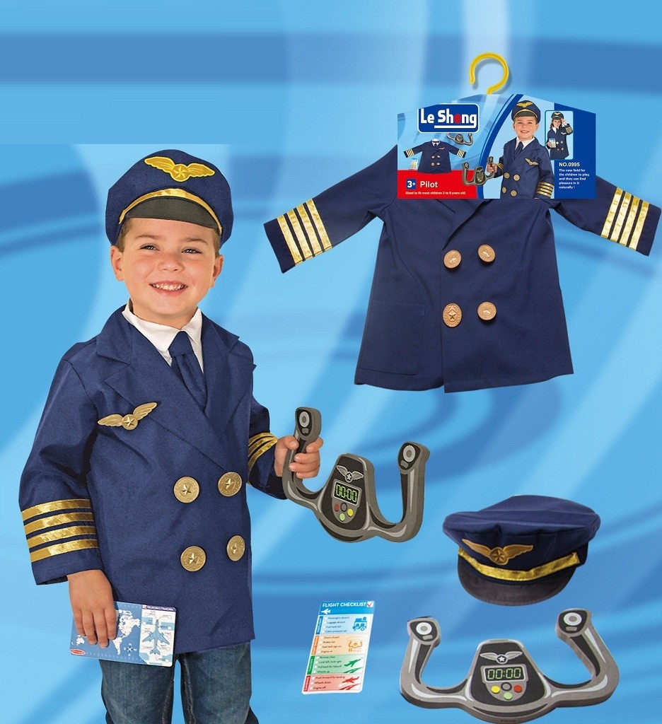Детский набор пилота включает в себя темно-синюю рубашку пилота на пуговицах с золотистыми полосками на манжетах, а также штурвал и кепку синего цвета с черным козырьком.