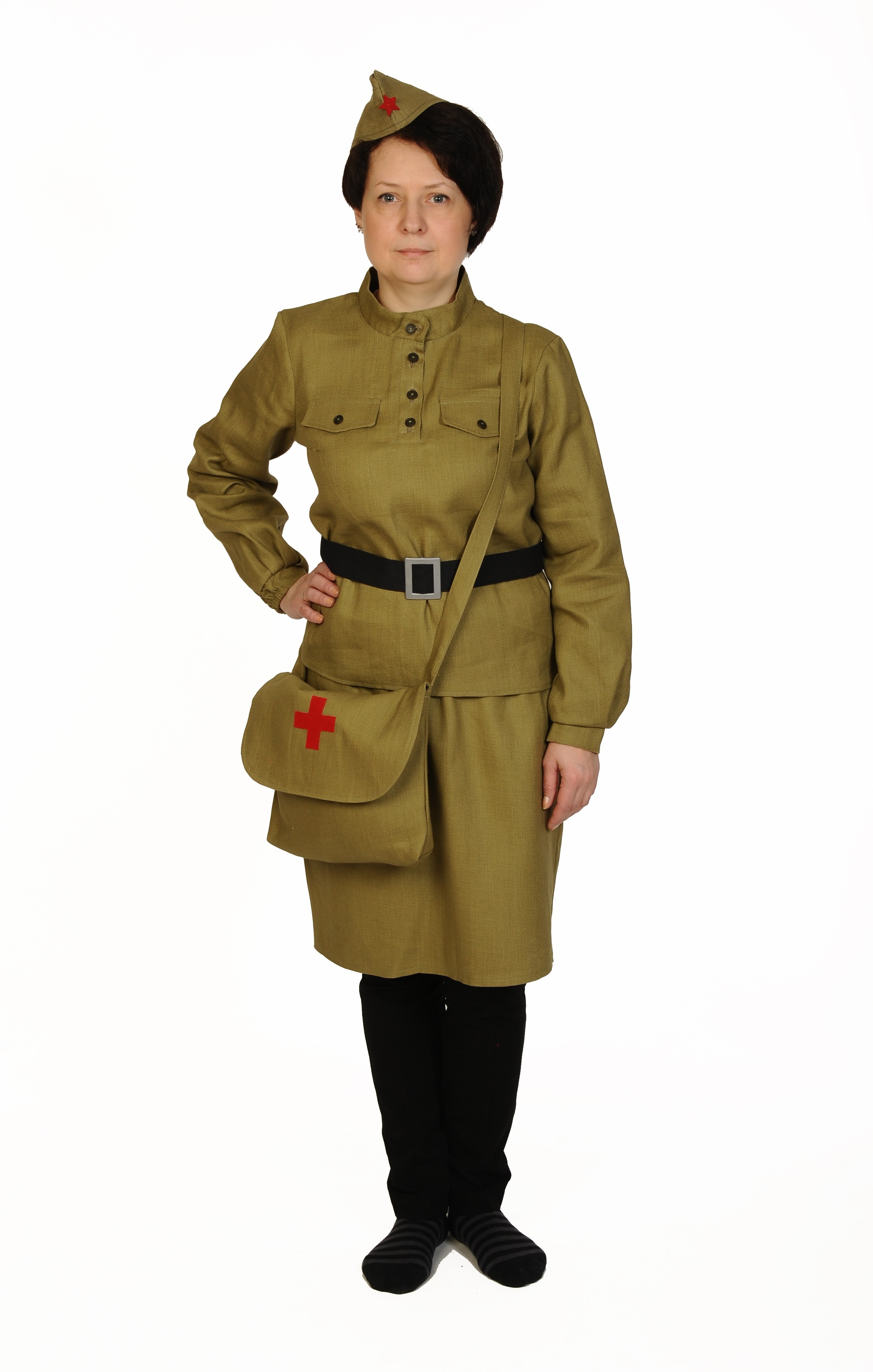 Костюм отважной военной медсестры послужит отличным нарядом для театральных постановок на 9 мая и 23 февраля. Костюм выполнен из плотного материала цвета хаки и включает в себя юбку, гимнастерку, ремень, пилотку и сумку с красным крестом.