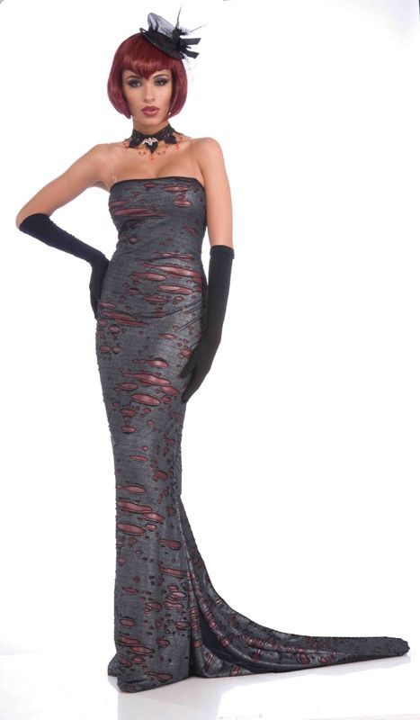 Готическое платье идеально подойдёт для празднования Хэллоуина и подобных вечеринок. Платье выполнено в сером цвете с порезами. Это длинное великолепное платье можно сочетать с различными шляпками, перчатками, украшениями и другими аксессуарами, также можно подобрать парик.