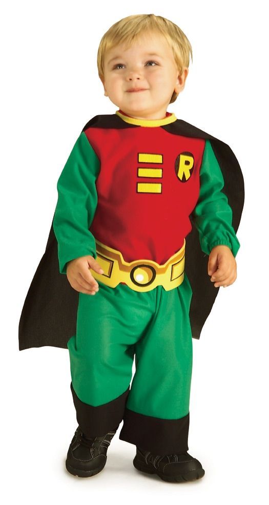 Костюм для малышей Робин включает в себя красно-зеленый комбинезон с эмблемой, черный плащ и маску на глаза. В этом костюмe малыш может стать хорошим напарником Бэтмена.